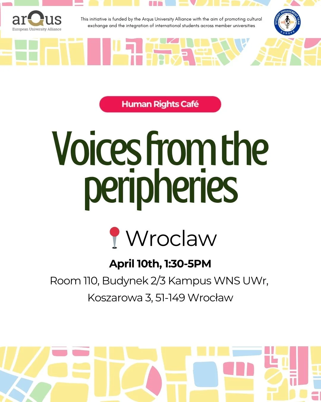 Human Rights Cafe we Wrocławiu! Human Rights Cafe, czyli międzynarodowe wydarzenie poświęcone prawom człowieka, przybywa do Wrocławia! Tegoroczna sesja poświęcona jest tematyce równości, inkluzywności i mechanizmów wykluczenia we współczesnym świecie i nosi tytuł: 🗣️ VOICES FROM THE PERIPHERY Dołącz do nas w całej Europie, gdzie studenci, naukowcy i społeczności spotykają się, by porozmawiać o tym, […]